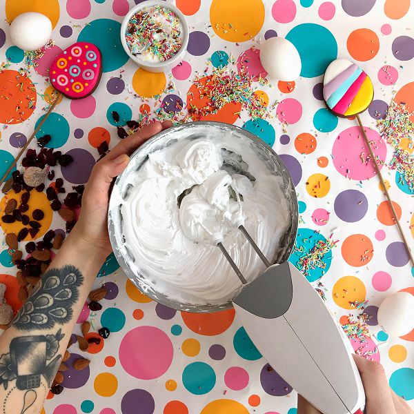 Белок и сахар обьеденим в миске и поместим на водяную баню. Взбиваем смесь миксером на средней скорости, нагревая до 60 градусов. Снимем емкость с бани и продолжим взбивать до устойчивых пик. Окрасим меренгу в любимый цвет и украсим шапочки куличей. Несколько дополнительных штрихов: безе, посыпушки или нарядные пряники на палочках,— и ваш идеальный кулич готов.