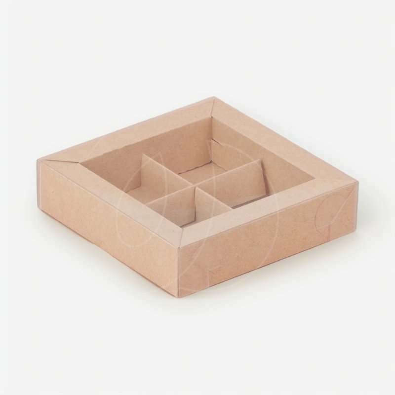 Доставка Коробка на 4 конфеты с прозрачной крышкой крафт 12х12х3 см из магазина в вашем городе: