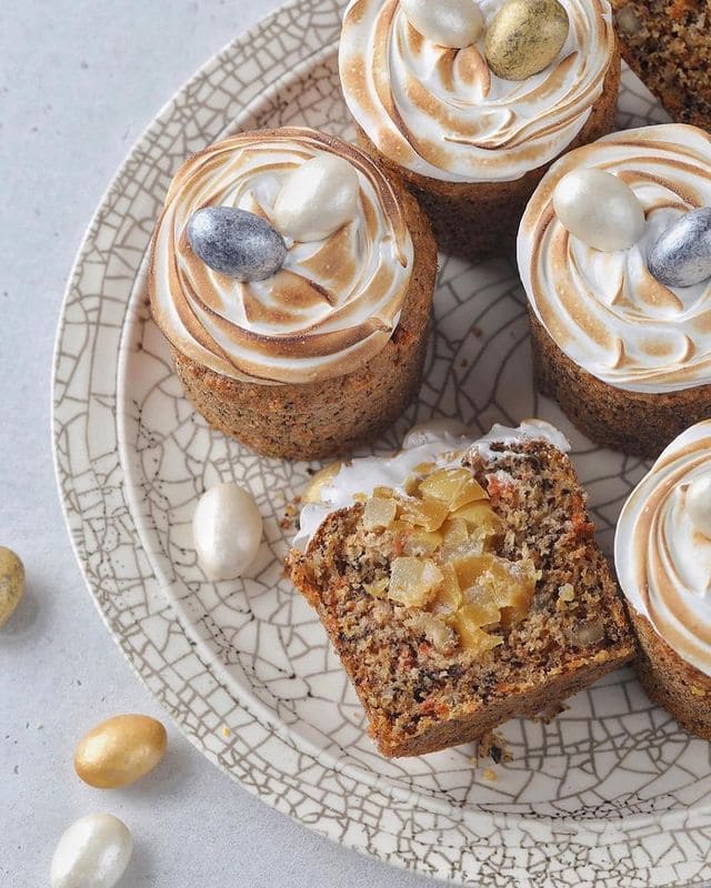 Бездрожжевой морковный кулич с карамельной грушей и меренгой